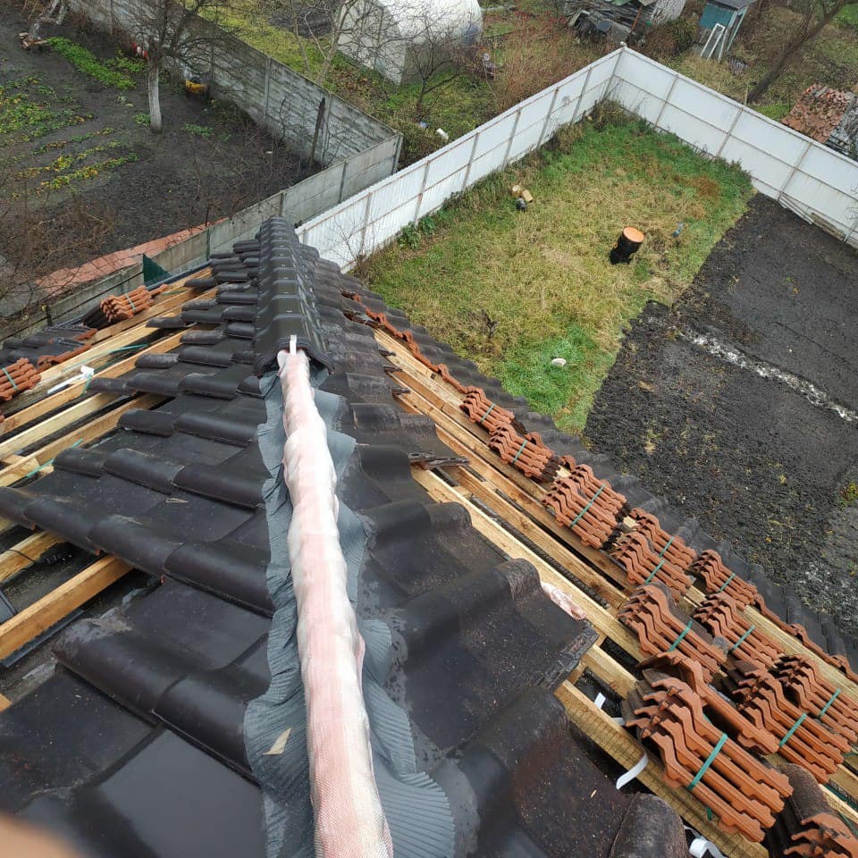• Устройство и укладка мягкой кровли. Проводится подготовка основания стропил каркаса и обрешетки, теплоизоляционные мероприятия для утепления, укладка материала кровли;